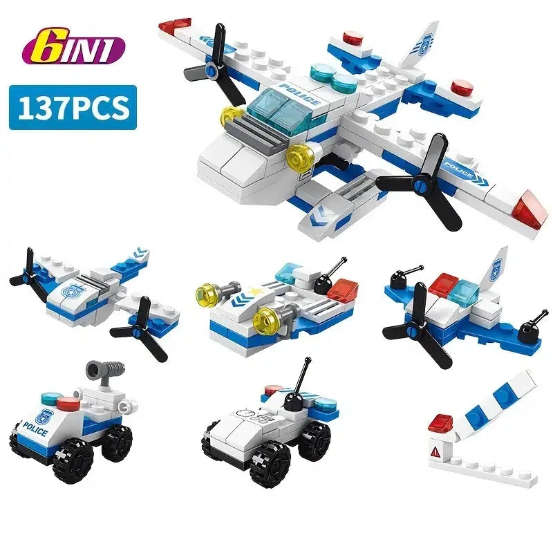 Bloques de construcción tipo lego con 137 piezaspuede armar hasta 6 modelos diferentes en la siguiente combinación5 vehículos pequeñoso1 vehículo grande (nave)ADVERTENCIA!!!!!Contiene piezas pequeñas que puede causar riesgo de asfixia, no dejar a los pequeños sin supervisión.